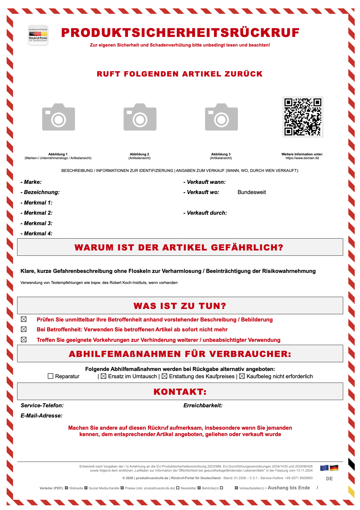 Für Produkte sind gem. Durchführungsverordnungen (EU) "2024/1435 vom 24. Mai 2024" und "2024/90426 vom 24. Juli 2024" Gestaltung sowie Inhalte von Rückrufanzeigen und Sicherheitswarnungen seit 23.12.2024 zwingend vorgeschrieben; diese Vorgaben sind zugleich auch für Lebensmittel anwendbar. Um produktverantwortlichen Wirtschaftsakteuren eine praxistaugliche und arbeitserleichternde Hilfestellung an die Hand geben zu können, wurde durch produktrueckrufe.de eine makrofreie "Dokumentvorlage" (*.dotx) für MICROSOFT WORD entwickelt. Mit dieser kann - unter Verwendung zahlreicher, individuell(st) ausfüllbarer Formularfelder - bei innerhalb kürzester Zeit - auch ohne jegliche Vorkenntnisse - ein rechtssicheres Dokument erzeugt werden, das für alle der zu bedienenden Kommunikationskanäle (als ) geeignet ist.